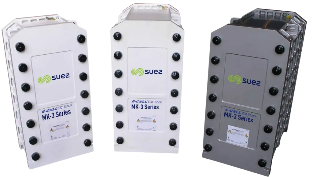 Elektrodeiyonizasyon (EDI), ters ozmoz (RO) sonrasında suyu sürekli olarak iyonlarından arındırmak için elektrik alanı, seçici iyon değişim reçinesi ve iyon geçirgen membranları bir arada kullanır. E-Cell markası, Veolia Water Technologies çatısı altında geliştirilen ve dünya çapında 4 000’den fazla kurulumda çalışan lider modül serisidir. Kimyasal rejenerasyon gerektirmemesi, sabit ürün kalitesi (≥ 16 MΩ·cm) ve düşük toplam işletme maliyeti sayesinde karışık yataklı (MB) reçine sistemlerine güçlü bir alternatiftir.
